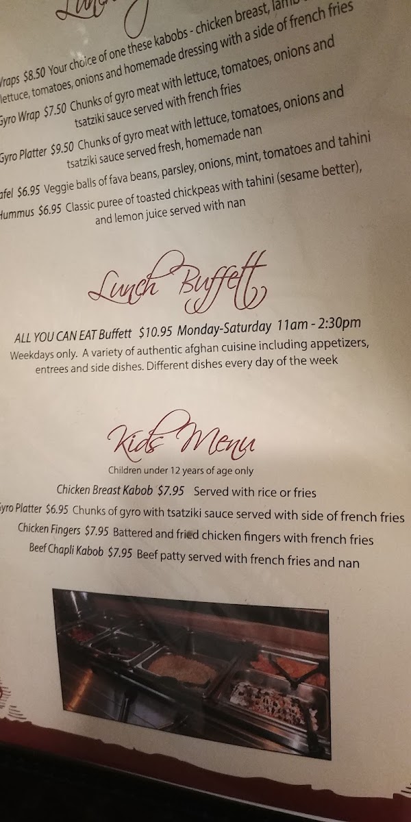 The atmosphere is inviting, enriched by Afghan decor, music, and hospitable staff who prioritize your dining experience. Families can enjoy kid-friendly options like crispy chicken fingers and flavorful kabob skewers. With generous portions and a focus on authenticity, Afghan Kabob Cville stands out as a must-visit for anyone eager to explore the heart of Afghan culinary tradition.